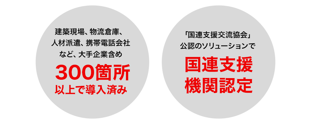 「OneCheckTAB」は現在、外国人採用や、本人確認のマーケットなど、約300箇所で導入されています。また、異文化の共生と世界人類の平和を目指すNPO法人「国連支援交流協会」公認の国際貢献事業にも認定されています。