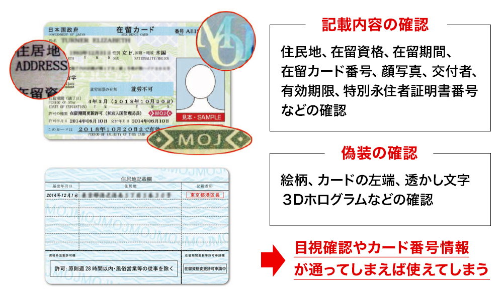 現在、偽造カードによって在留資格を偽って働く不法就労は社会問題となっており、外国人本人だけではなく雇用者も逮捕される可能性があります。また、入国管理局が推奨する目視による確認では、ほとんどの偽造カードを判別することが難しくなっています。