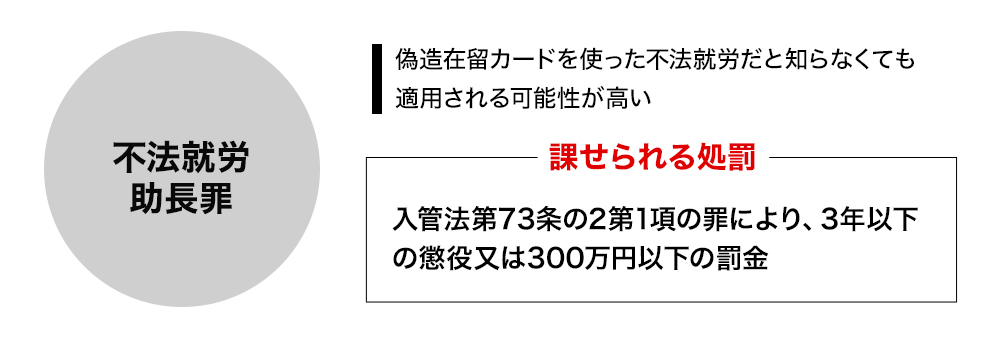 - ・偽造在留カードを使った不法就労は、本人だけではなく、雇用主側も「不法就労助長罪」という罪に問われる