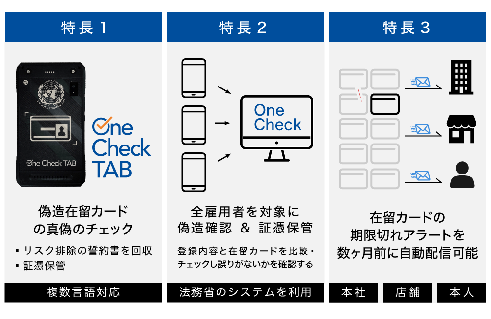 弊社は、在日外国人が持つ在留カードが偽造品かどうかを簡単にチェックできる機器「OneCheckTAB」を開発・提供しています。