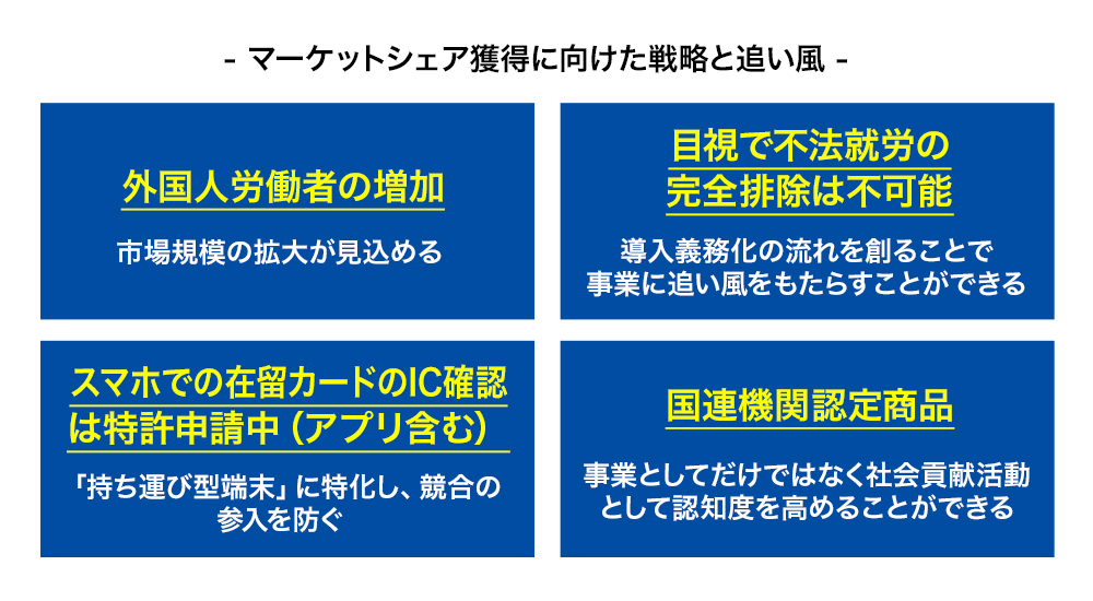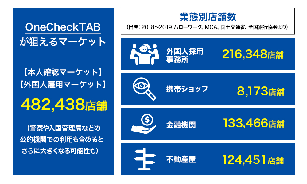 外国人労働者を採用している事業所は現在約21万箇所あり、その数は「労働力の不足」の観点から、今後さらに増えていくでしょう。さらに、「就労市場」だけではなく、携帯電話の契約時や金融機関の口座開設時などの「本人確認市場」にも展開が可能です。