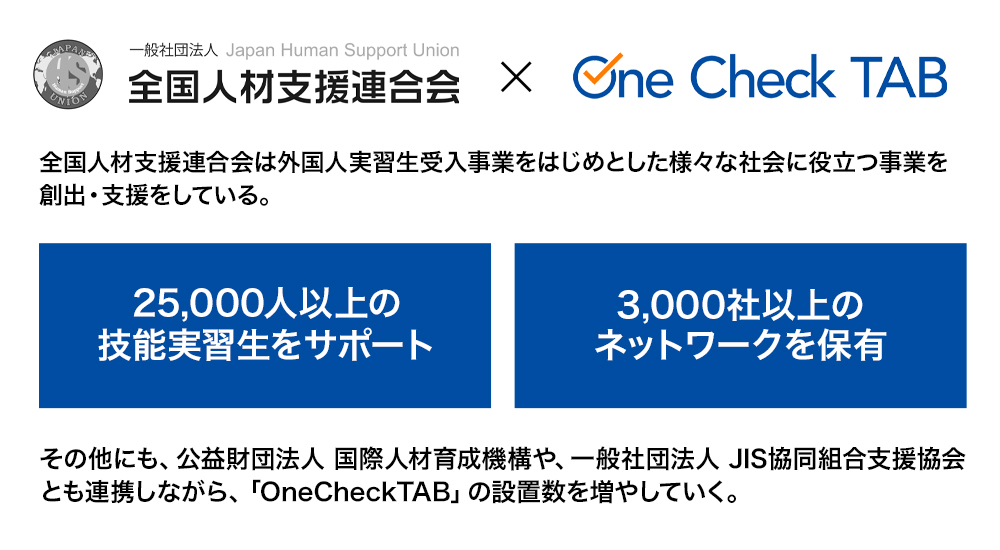現在、既に約300箇所以上の企業や店舗で「OneCheckTAB」が導入されていますが、今期は10,000台の導入を目指します。その為に、外国人技能実習生の受け入れ企業3,000社以上と繋がりのある「全国人材支援連合会」などのパートナーと提携しながら、導入を拡げていきます。
