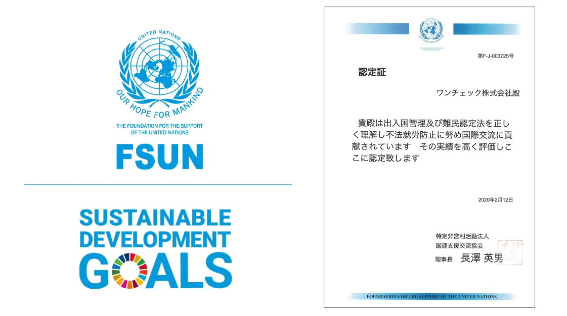 弊社の偽造在留カードチェッカー「OneCheckTAB」は、日本で暮らす外国人を幸せにすることを目的に、国連支援機関の一つである「国連支援交流協会(FSUN)」の認定を頂いております。