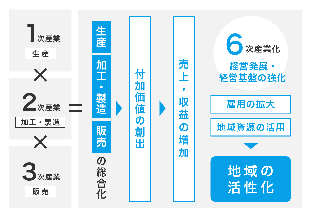 そこで、昨今注目を集めているのが、地域の6次産業化です。これは地域の1次(生産)×2次(加工)×3次(販売・観光・飲食等)産業が連携しながら、商品の付加価値を高めていくなどの取り組みです。6次産業化は、加工や流通を複合させたところに特徴があり、「作物のブランド化」にも寄与し、まだ知られずにいる魅力的な作物の発掘にもつながるなど、地域産業の活性化に有力なものと考えています。