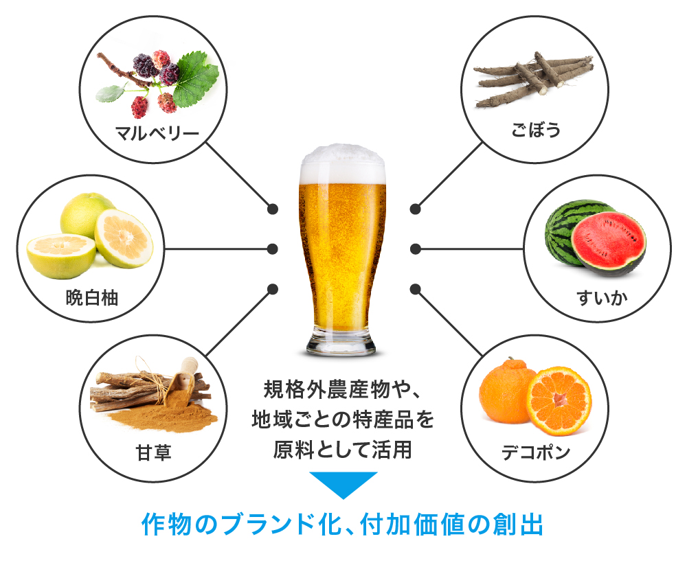 弊社は、国内でも珍しいビールによる「6次産業化」を推進していきます。規格外となって市場に出回らない廃棄作物に焦点をあて、付加価値をつけることで流通を拡大させていきます。
