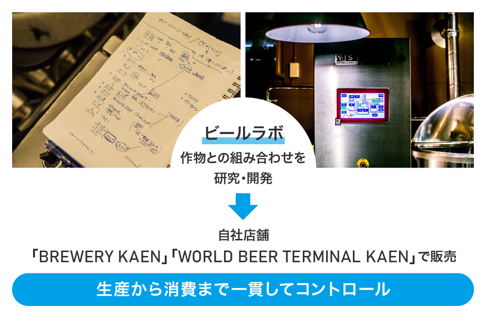 今後、さらに多品種の作物との組み合わせを研究・開発し、オリジナルクラフトビールの可能性を拡張させる「ビールラボ」として成長していきます。そして、自社で有する「BREWERY KAEN」「WORLD BEER TERMINAL KAEN」の2店舗を供給網及び、消費者の好む味の研究の場とし、生産から消費まで一貫してコントロールしていきます。