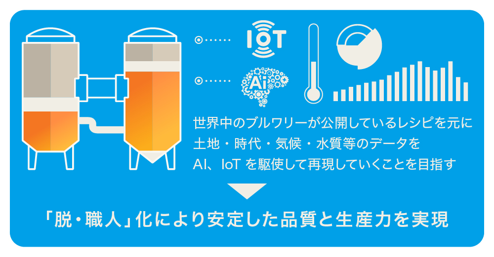 弊社はそうしたビッグデータを元に、土地・時代・気候・水質等のデータをAI、IoTを駆使して再現していくことを目指しています。(ビール醸造プロセスに於いてのAI、IOTの活⽤事例は こちら)