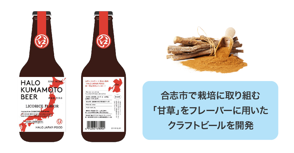 代表的な例としては、自然電力ファーム株式会社、熊本県合志市(こうしし)の協力の下、「甘草」をフレーバーに用いたビールを開発し、発売に至りました。この取り組みはテレビや新聞のメディア取材が入る等、注目を浴びた事例です。(詳しくは こちら)