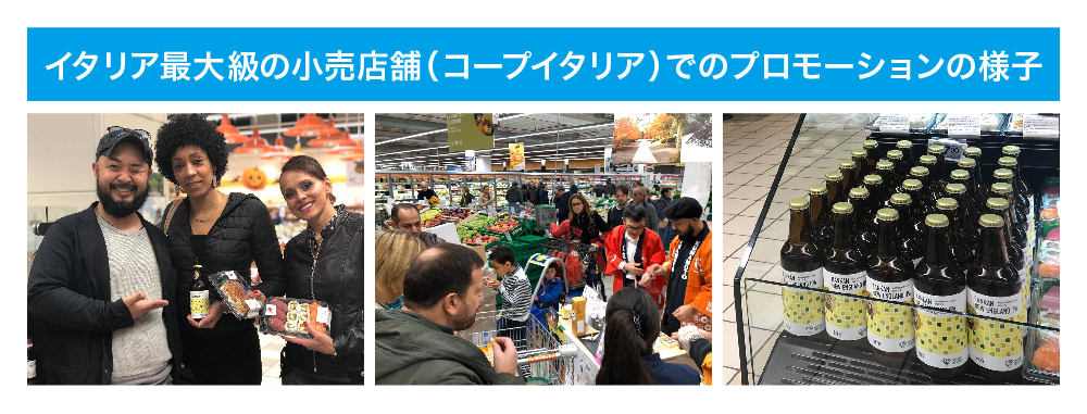 イタリア国内に約1200店舗を構える、イタリア最大級の小売店舗(コープイタリア)で、熊本市長と共にプロモーションと販売をおこない、イタリア人からも予想以上に好評を得ています。クラフトビールは、欧米をはじめ、東南アジアでも市場が急拡大しており、日本においても酒税法改正が後押しとなり、現在の10倍の市場になると言われています。