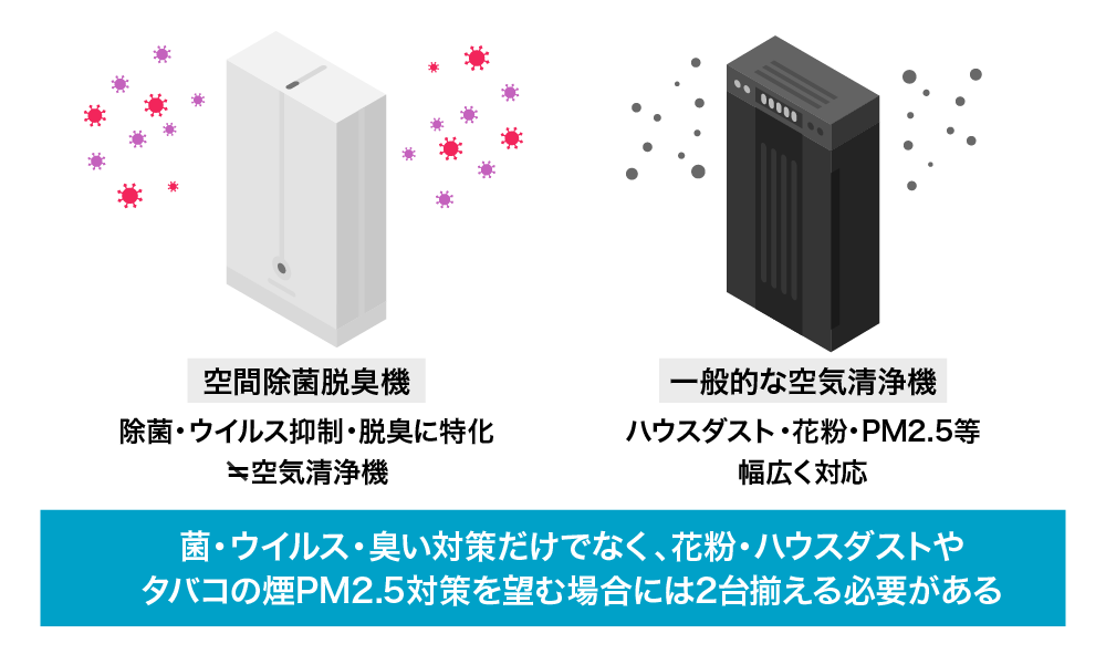 しかしながら、既存商品の多くは、これらをオールインワンで解決するものではありません。菌やウイルスを除菌する機能を備えた除菌脱臭機とハウスダストや花粉を除去する空気清浄機は一見、同じ機能に思われがちですが、それぞれ目的が違い、消費者はそれぞれの機能を求めると2台持ちを余儀なくされる状況にあるのです。