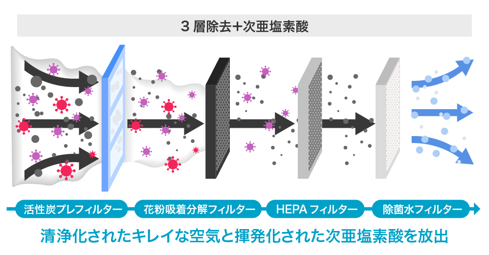 「ウイルスウォッシャー」の特徴としては、次亜塩素酸水の生成技術による除菌、ウイルス対策に加えて、三種構造のフィルターを搭載しており、ハウスダスト、花粉、PM2.5等を集塵、除去する機能を備えた点です。