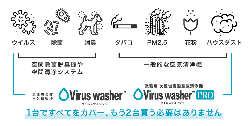 このたび、これまでの次亜塩素酸応用技術を集積した空気清浄機「ウイルスウォッシャー」を開発いたしました。これは空気清浄と除菌脱臭機能を1台で提供する他に類を見ない商品です。