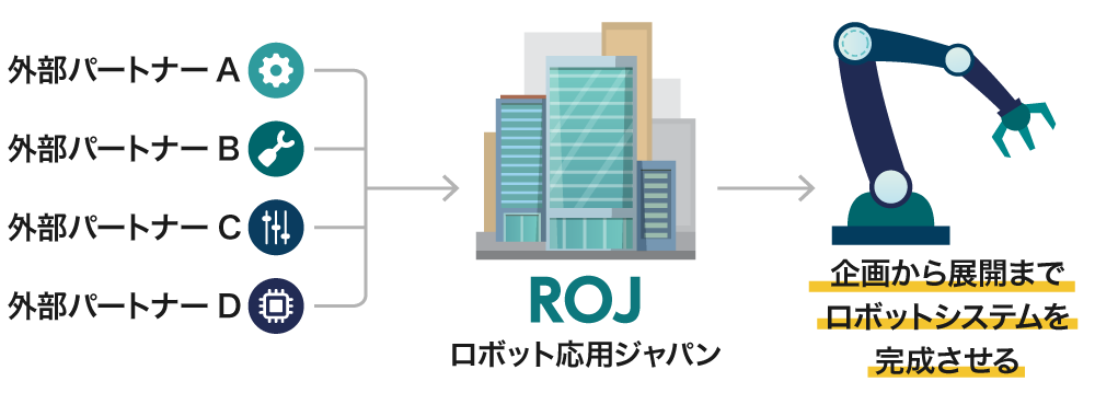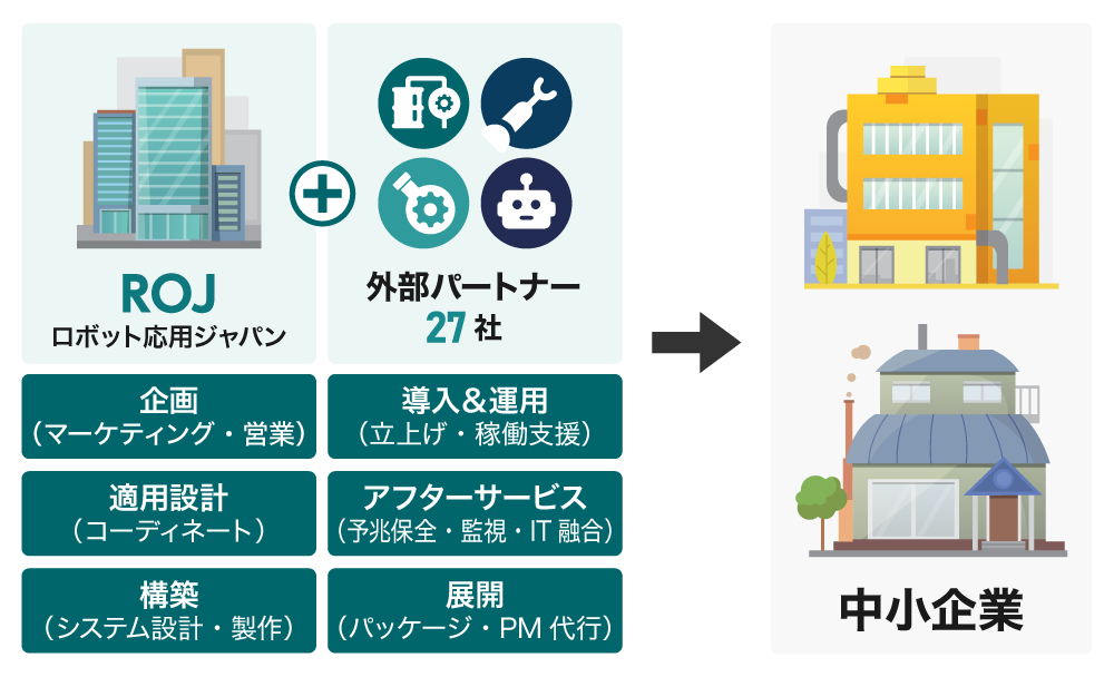 弊社が提供する、“細分化され汎用性の高いシステムを短期間、低コストで導入する”サービスは、外部企業27社との協業による「チームROJ」によって実現されています。