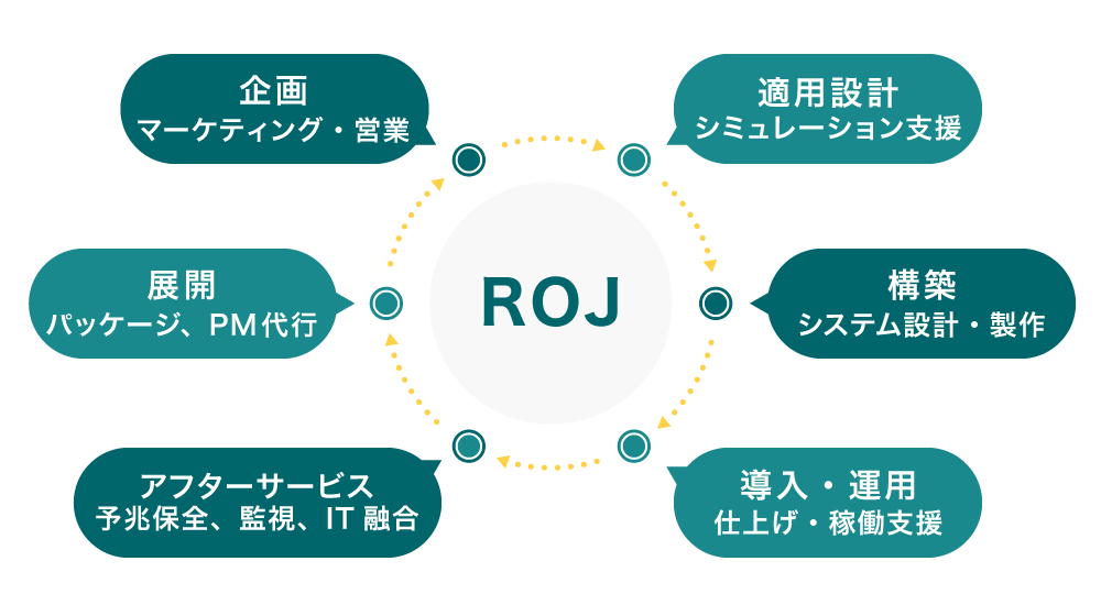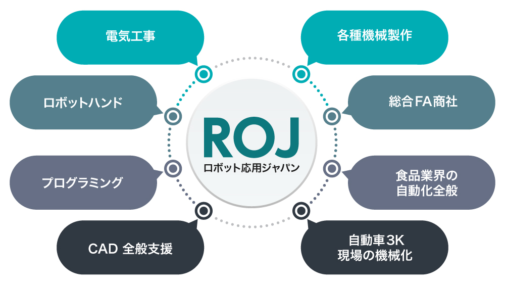 「チームROJ」にはロボットハンドやアーム等のロボットメーカーや、ベルトコンベア等の製造業に必要なロボット事業者をはじめ、システムインテグレーターや配線加工の専門家など様々なジャンルのプロフェッショナルが集っています。これらのチームが協力することで、依頼者に最適なFAを弊社が導入しています。