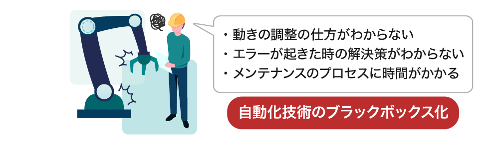 そうなることで、企業側は自動化システムの内部の仕組みが分からず、問題が発生しても自分で対応ができない、いわゆる“ブラックボックス化”してしまう問題があります。