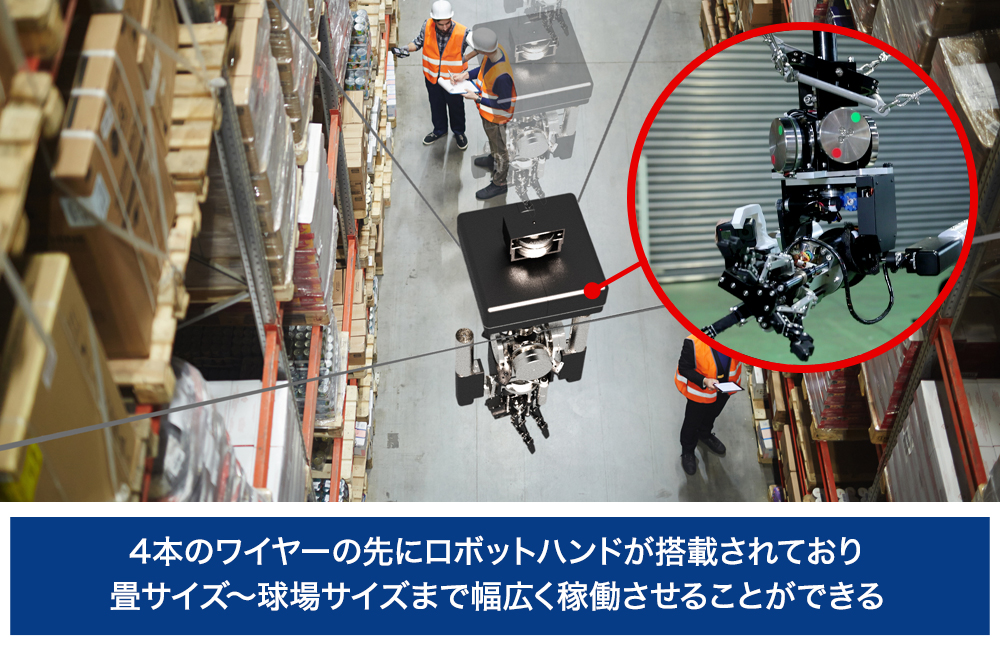 「Flying Carry」は、4本のワイヤーで先端に取り付けた物体(ロボットハンド等)を上下左右自在に動かすことができるドローン型の装置です。畳サイズ〜球場サイズまで幅広く設置することができ、元々はコンサートやスポーツの撮影に使われていた装置のアイディアを元に実現しています。