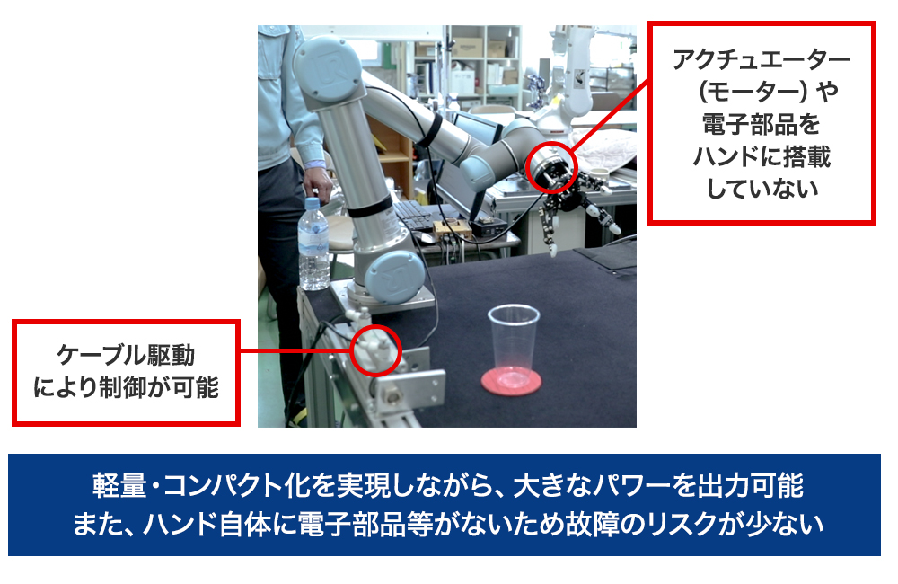 短所はモーターで直接的に制御できない非駆動関節(関節の一部を動かすといった操作)が存在することです。しかし、シンプルな構造なので耐久性・操作性に優れ、小型軽量化が図れます。それにより、他社・他方式に比べ、安価に提供することが可能です。