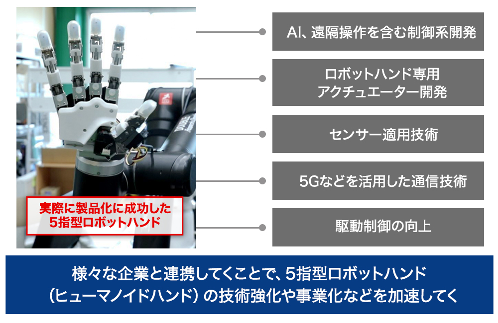 このため、AI、遠隔操作を含む制御系開発、アクチュエーター開発、センサー適用技術を開発する企業や、各社間調整活動を行う役割を持つ商社などと連携し、技術開発・事業化を促進する体制を弊社主導で整えていくことを目指します。