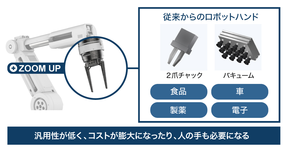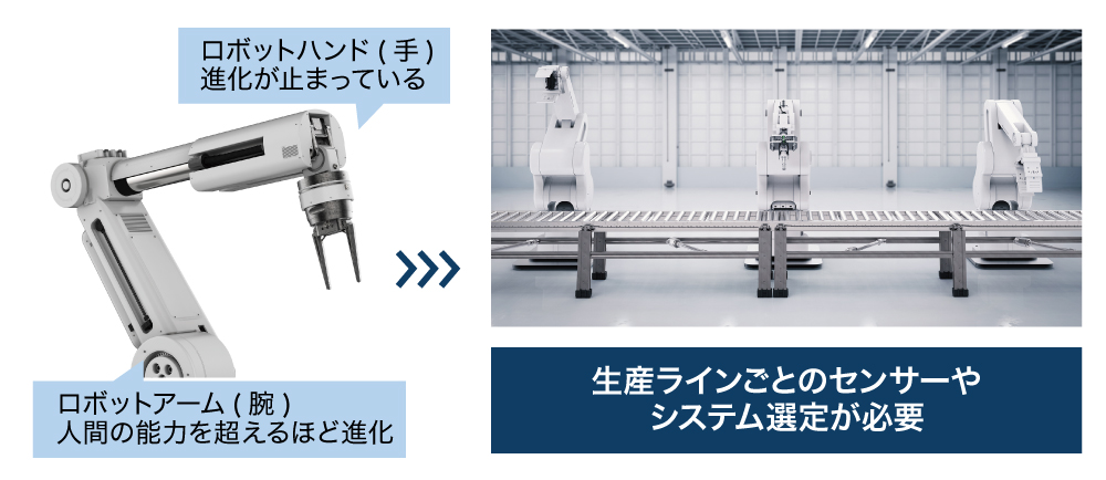 さらに食品などの、1つ1つの「大きさ」や「硬さ」などが変わるものはロボットの利用が難しく、結果、人手が求められています。