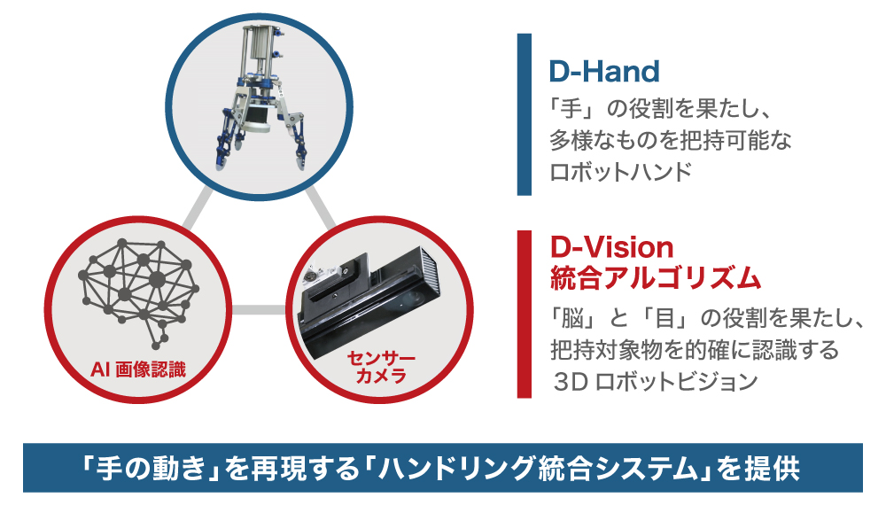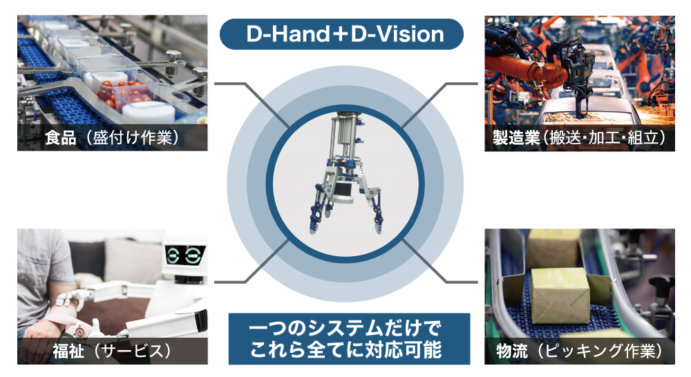 そして、次世代ハンドリングシステム「D-Hand(ディーハンド)」「D-Vision(ディービジョン)」の開発に成功し、当技術をまず、産業向けに展開しています。