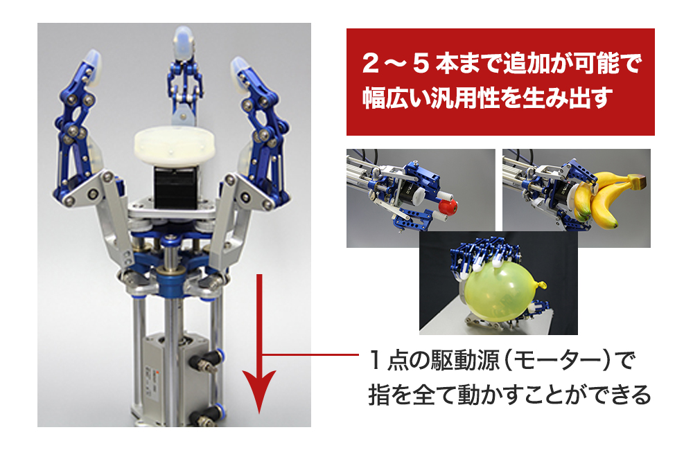 ロボットハンド「D-Hand」では、1つの駆動源でハンド全体を動かすことができ、様々なモノを、その形状になじませて掴むことができます。また、指の数を3本、5本と変えていくことで、掴む方向を変えながら把持(しっかりと握ること)させることができます。
