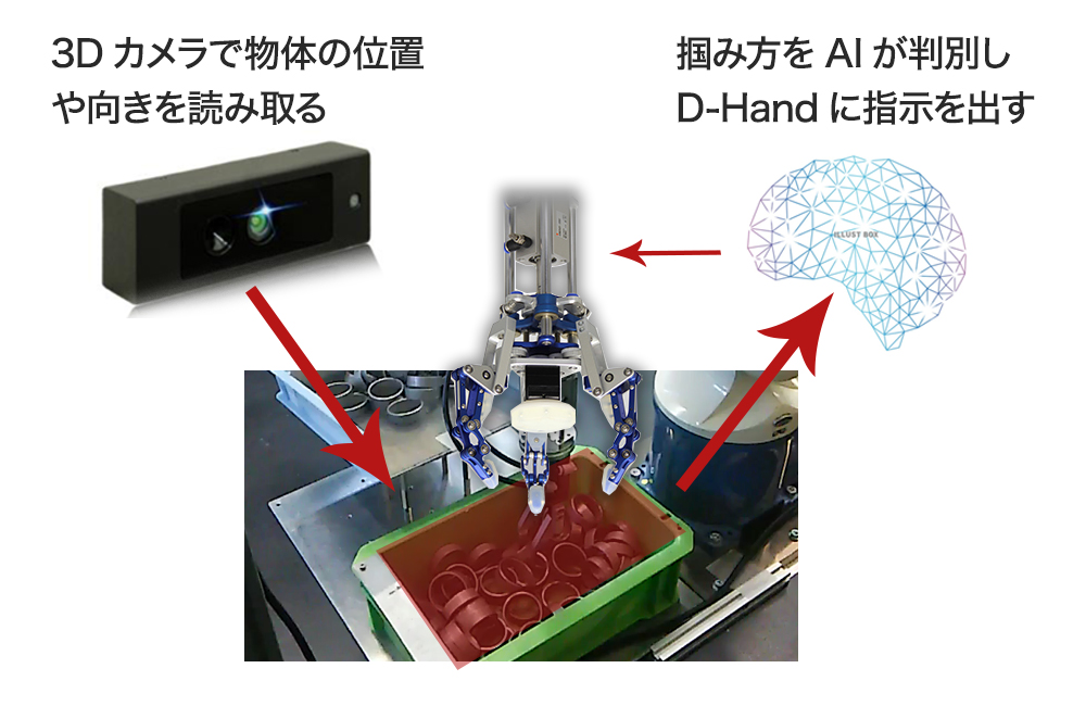 弊社が開発した次世代ハンドリングシステム「D-Hand」「D-Vision」は、対象物の形を3次元カメラで立体的に認識し、それを指の動きと同じ構造を持ったロボットハンドで掴むことができます。