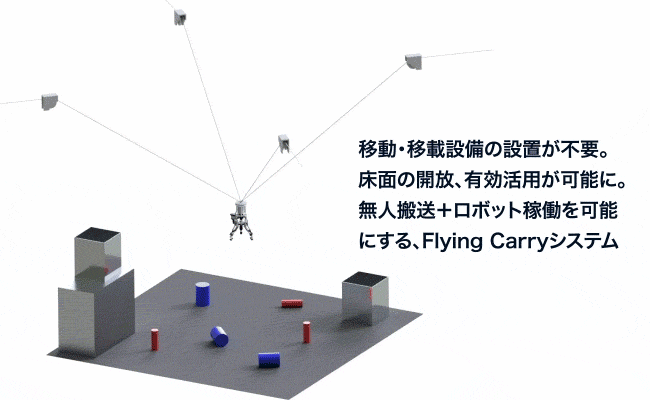 「Flying Carry」は、イベントやスポーツ中継などで利用されている空撮システムに使われる技術と、弊社のロボット技術を融合させたものです。