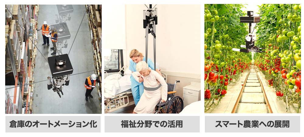 ドローンとの一番の違いは、安全面(イベント会場でも利用されている)と長時間稼働(直接給電可能)です。更には、大きな重量への対応・床面の非占有・天候に左右されず利用できる等の特徴を有していることから、大規模な工場への導入や、農業への活用、さらに、サービスロボットへの応用が可能になると考えています。