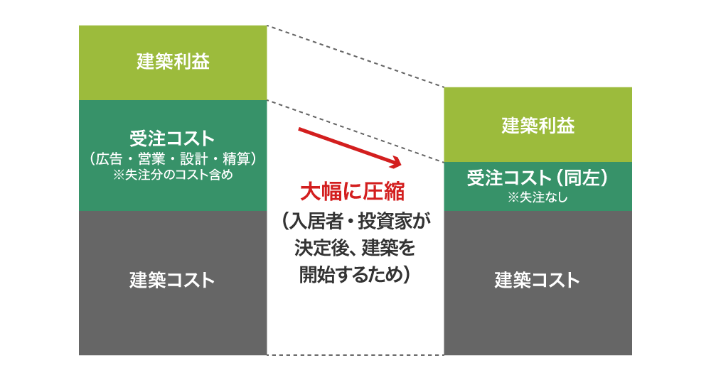 また、建設業者は、既に出来上がった図面をダウンロードして建築するだけなので受注コストがほぼかからないだけでなく、通常起こりうる失注がほとんど無くなります。
