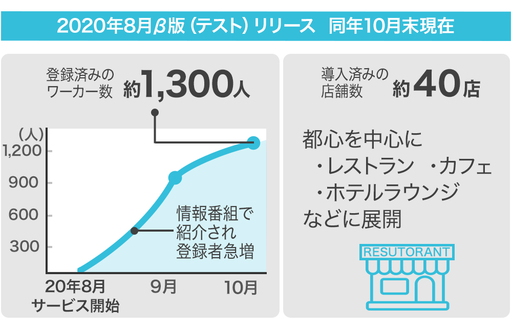 「テレスペ」は、そういった店舗の空席をスマートフォン上でリアルタイムに可視化することで、空席とワーカーを簡単にマッチングさせることの出来るサービスです。2020年8月にサービスをβ版(テスト版)で開始し、2020年10月末時点で都内の飲食店を中心に約40店舗で検証中です。LINE(LIFF)ミニアプリ「テレスペ」にも既に約1,300人のユーザーに登録されています。