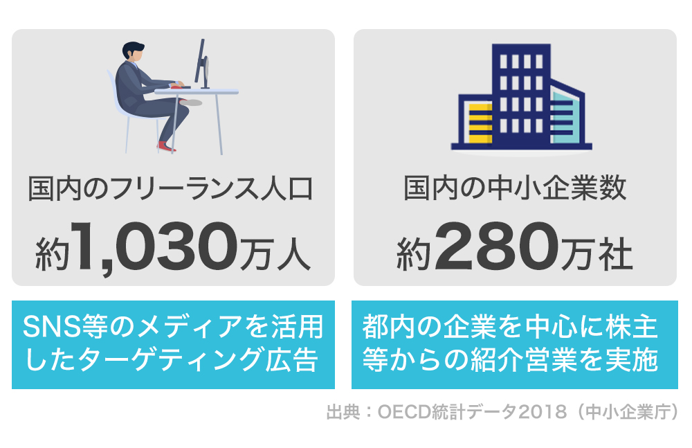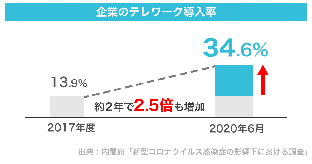 新型コロナウイルスの影響もあり、主要都市にある30%以上の企業がテレワークを導入するようになりました(出典:内閣府、テレワーク導入率2020年)。それと同時に、個人で働く人も徐々に増加しています。日本では現在、約1,034万人がフリーランスとして働き、その経済規模は1兆円を突破しました(出典:ランサーズ、フリーランス実態調査2020年)。