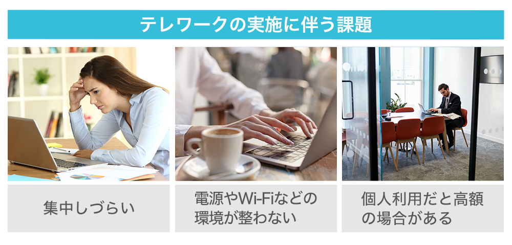 それに伴い、働き方や働く場所がますます多様化していくことで、働く場所への新たな悩みも増えてきました。それは、働く場所の確保です。テレワークを実施するにあたり、自宅では集中出来ないことや、外のカフェでは電源やWi-Fiの環境が整わないなど、なかなか仕事に適したスペースを確保するのは容易ではありません。