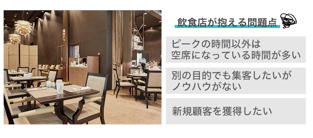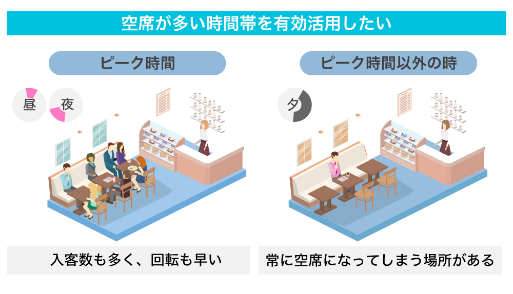 ただ一方で、「ワークスペースが利用されない」ことで悩みを抱えている方々もいます。それは飲食店やホテル、カラオケ店などのテレワーク実施店や、コワーキングスペースなどです。これらの店舗は、営業する時間帯の間で客数にムラが起こりやすく、空席の時間が日常的に発生してしまうのです。