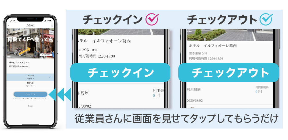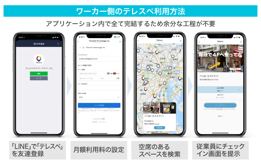 働く場所を探すワーカーは「LINE」で「テレスペ」を友達登録し、利用者登録をしたその日からサービスが利用できます。「テレスペ」のマップ上に今リアルタイムに空席のあるスペースだけが表示されるので席数をチェック、そこから予約なしでチェックした店舗に向かい、従業員にチェックイン画面を提示(従業員が画面タップ)するだけで仕事を開始できます(別途、スペース利用料が必要になります)。帰る際もチェックアウトボタンを提示(従業員が画面タップ)するだけで決済まで全てを自動化します。