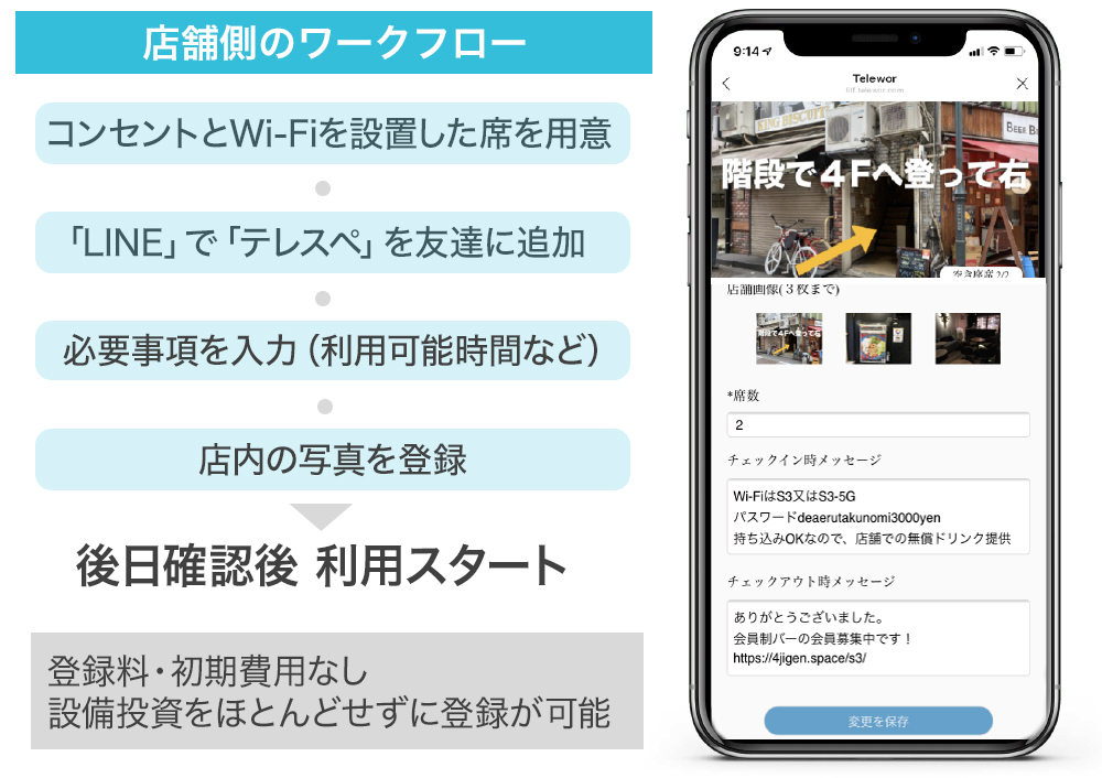 一方、飲食店やカラオケ、ホテルなどのテレワークプランを提供する店舗やコワーキングスペースなどのオーナーは、初期費用や月額費用の負担なしで店舗を登録できます。「○時〜○時の間で4席」などと時間や席数を区切ることで、お店の空いた時間帯だけ「テレスペ」へ掲載できるのもメリットです。