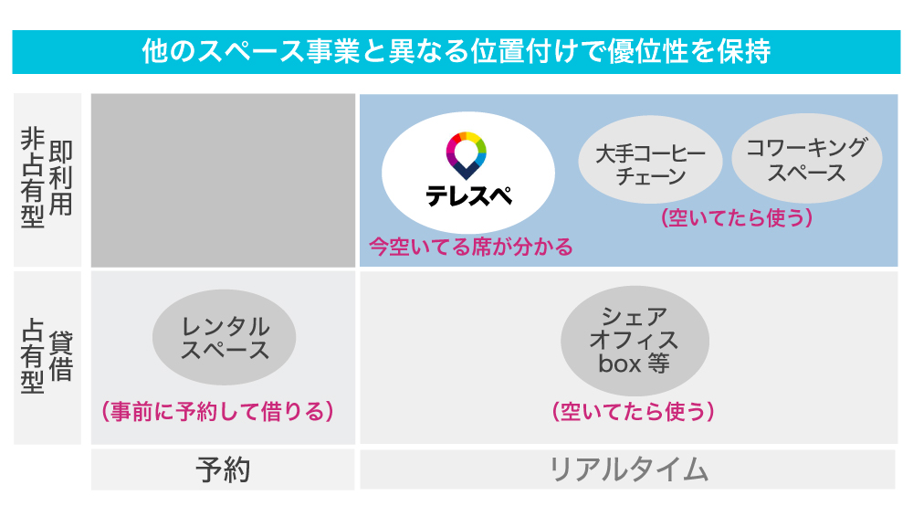 競合に当たる企業として、スペースのレンタルサービスがあります。しかし、レンタルスペースは予約が必要です。今から使えるワークスペースを探すときに、街中で足を止めスマートフォンを操作して予約リクエストを送り承認を待つのは現実的には難しく、また1人で利用するのにスペースを貸し切りで借りるのも経済的に無駄が多いでしょう。