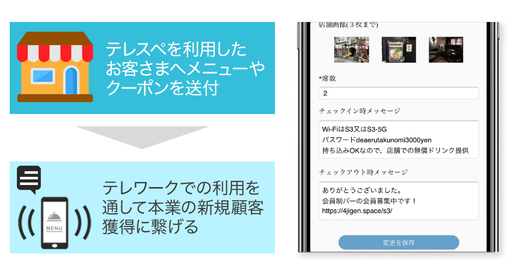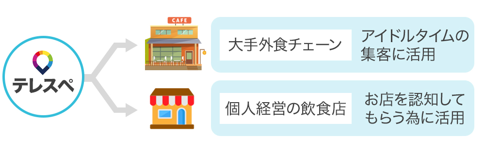 また、影響力のある大手チェーンに導入を進めると同時に、 国内にある多数の個人店にも営業をかけ『小さいスペースだけど、いたる所に「テレスペ」がある』といったような店舗数の増大にも努めていきます。また、ワークスペースとして店舗を利用した人には、お店のクーポンやメニューなどを通知することで、新規顧客獲得にも活用していただけます。