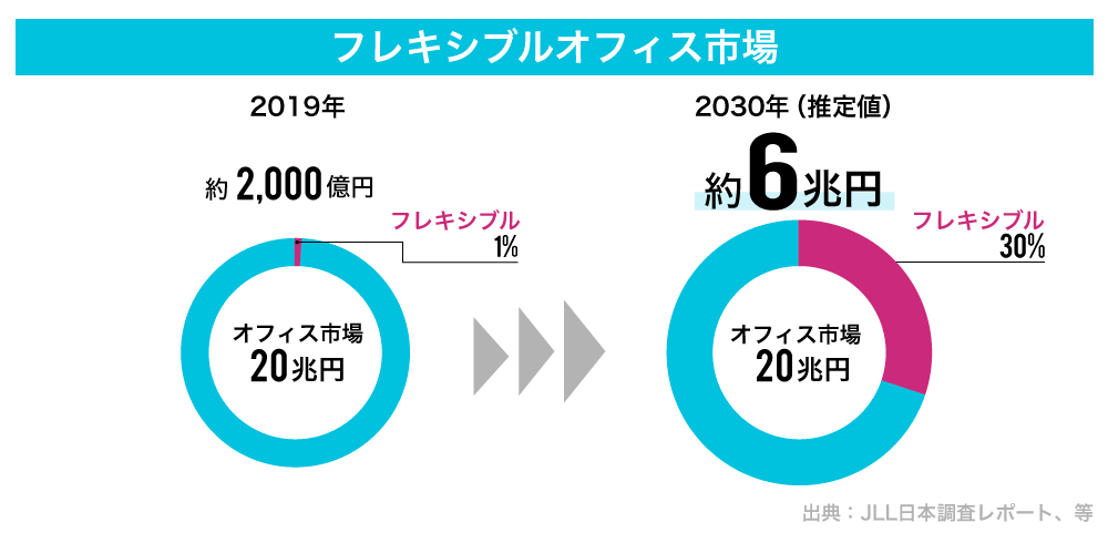 日本のオフィス市場は約20兆円あるといわれていますが、テレワークによって働く場所が変化しているので、この20兆円の市場が「動いて」います。コワーキングスペースなどのフレキシブルオフィス市場は2019年にオフィス全体の1%だったものが、2030年までにオフィス全体の約30%(約6兆円)にまで成長すると言われています(出典:JLL日本調査レポート)。