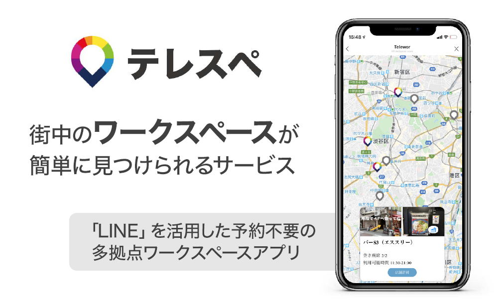 弊社は、飲食店・カラオケ店などのテレワークプラン提供店や、コワーキングスペースなどのワークスペースの空席状況をリアルタイムに可視化するLINE(LIFF:LINE Front-End Framework)ミニアプリ「テレスペ」を運営しているベンチャー企業です。