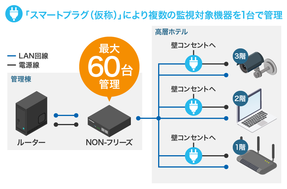 ããã«å¯ŸããŠãNON-ããªãŒãºãã®é»æºéšåãç¬ç«ããããã¹ããŒããã©ã°ïŒä»®ç§°ïŒããšçµã¿åãããããšã§ãé¢ããå Žæã«ããç£èŠå¯Ÿè±¡æ©åšïŒæå€§60å°ïŒã1å°ã®ãNON-ããªãŒãºãã§å¶åŸ¡ããããšãå¯èœã«ãªãã管çè ã®ã³ã¹ããå€§å¹ ã«åæžããŠãããŸãã