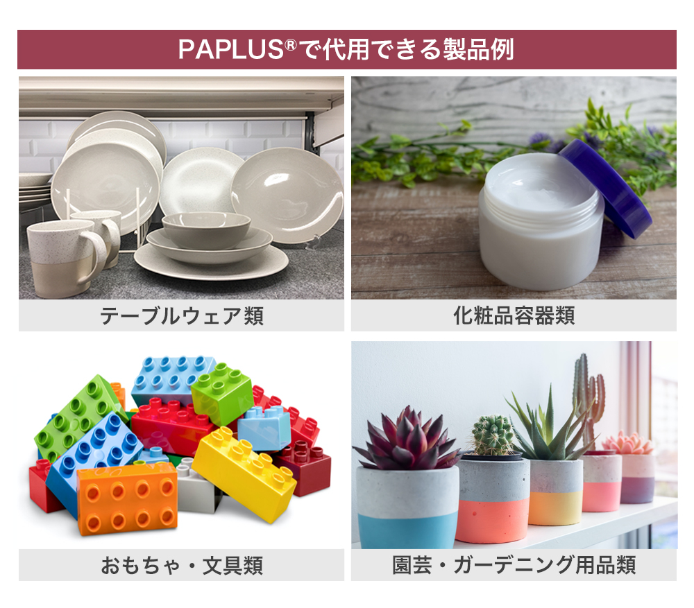 このように、「PAPLUS®」は多くのプラスチック製品との代用が期待でき、タンブラーやテーブルウェアや配膳トレー、化粧品容器などへの活用が今後予定されています。