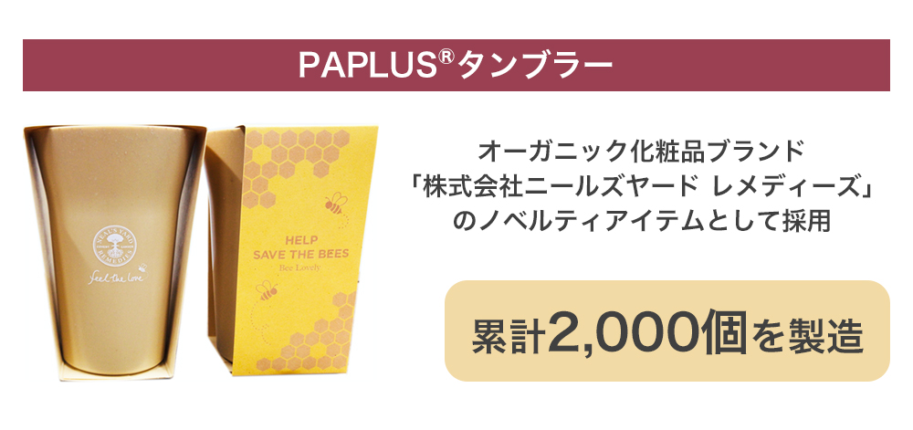 既に実用化も進んでおり、大手オーガニック化粧品メーカーである「株式会社ニールズヤードレメディーズ」において、「PAPLUS®」でつくられたマルチエコカップがノベルティ商品として採用された実績があります。