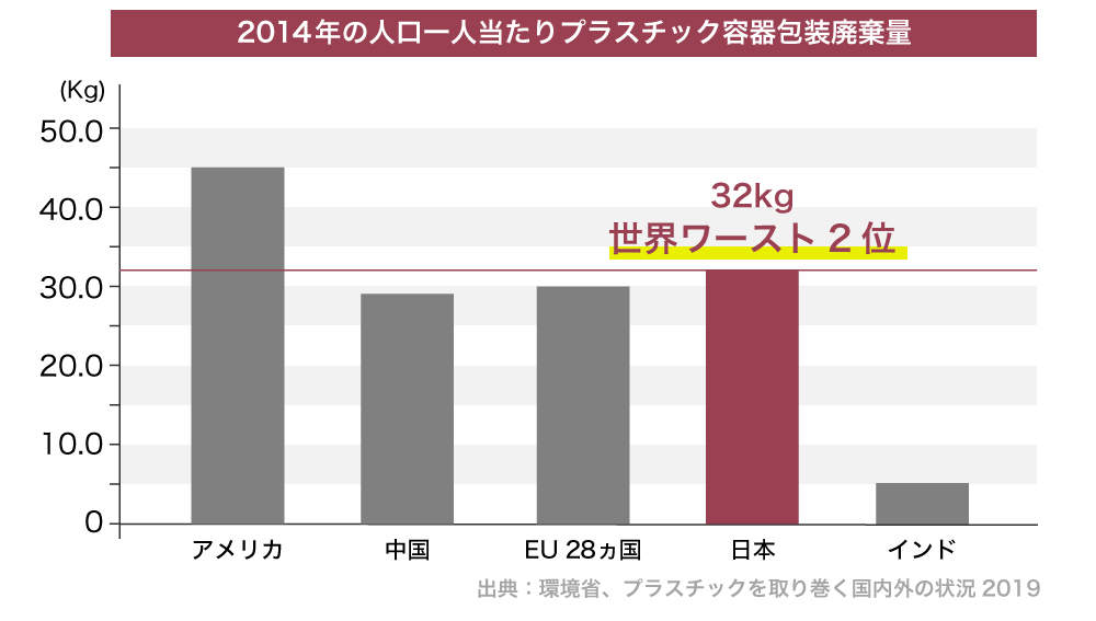 こうした対応の遅れが相まって、日本のプラスチックごみの廃棄量は人口一人あたりに換算すると年間32kgと、世界で2番目に多いというデータが公表されています(出典:環境省2019年発表)。