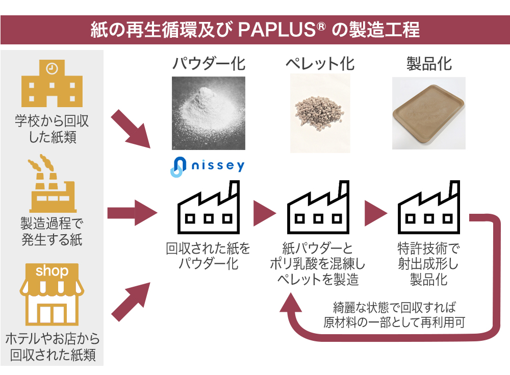 この市場の中で、既存の石油由来のプラスチック製品に代わるサステナブルな新素材として「PAPLUS®」を普及させ、食器やトレーなどの家庭用品から、建材や内装素材など幅広く展開させ、植物由来の素材の可能性を実際に感じてもらいたいと考えています。