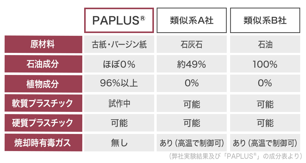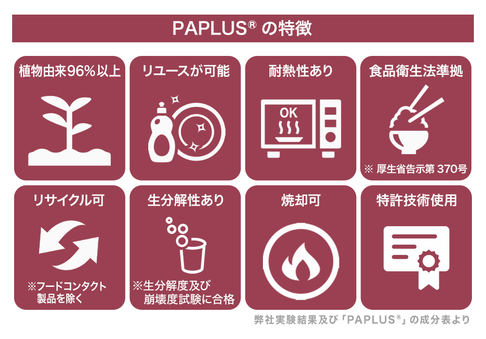弊社が開発した「PAPLUS®」は、植物成分が96%以上であるといった特徴を持ち合わせており、環境汚染の原因になる石油由来のプラスチック製品に代わるサステナブル(持続可能)な素材として今注目を集めています。(「PAPLUS®」の成分表より)