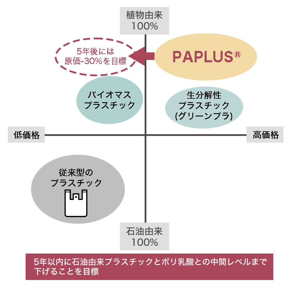 また、素材となる紙の調達においても、古紙調達のエキスパートである関連会社から原材料である高品質古紙を安定的に仕入れています。また自社設備の導入により、原材料の破砕と混錬のコストを30%程度削減できる見込みであり、「PAPLUS®」の素材ベースでの売価は、5年以内に石油由来プラスチックとポリ乳酸との中間レベルまで下げることを目標にコスト管理をしていく予定です。(弊社の研究計画資料より)