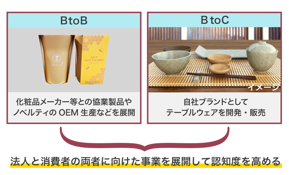 また、BtoBでは他社様とのコラボ製品や、OEMなどの展開を予定しています。具体的には、化粧品ブランドとの「PAPLUS®」製の化粧品容器の共同開発や欧州ブランドとのアウトドア製品の代替素材としての採用、建材としての活用など、国内外の数多くのメーカー様からご相談を頂いており、試作も始まっています。