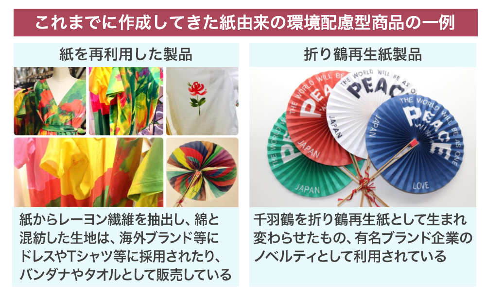 弊社は「PAPLUS®」を開発する以前から、紙の再資源化ソリューションプロバイダーとして、関連会社である株式会社日誠産業と共同で、損紙や古紙に付加価値をプラスした再資源化に取り組んでいました。具体的には、広島・長崎などに飾られた折り鶴をリサイクルしてデザイン扇を作成し、サステナビリティやエシカルなどの意識が高い国内外の有名企業やファッションブランドなどにノベルティアイテムとして活用していただいたりと、資源を有効活用した開発事業を多く手掛けてきました。