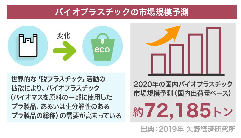 レジ袋の有料化など、石油由来のプラスチック製品の利用を減らす動きが国内でも広がってきたことなどにより、2020年の国内バイオプラスチック市場規模予測(国内出荷量ベース)は、約7.2万トンと、上昇傾向にあります(矢野経済研究所)。