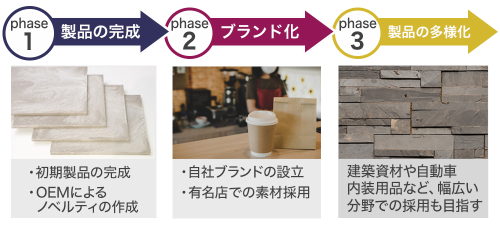 事業の根幹となる素材開発が完了した今、消費者向けに、デザイン性と機能性に優れた製品を国内外で販売することで認知度をあげつつ、企業向けには様々な業界におけるプラスチック成形品の代替素材としてOEM提供をしていく予定です。また、最新の原材料も積極的に取り入れつつ、常に最低の環境負荷と最高の付加価値を実現してまいります。